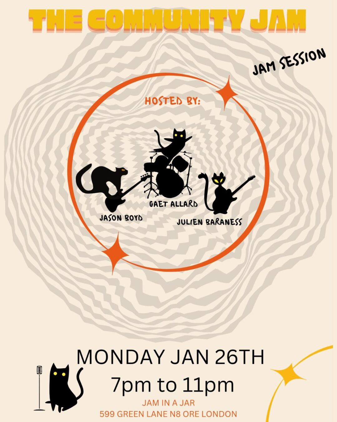 Join us every Monday night at Jam in a Jar on Green Lanes for an evening of music, connection, and creativity. We’re excited to welcome musicians and creatives of all levels to share some tunes, collaborate, and soak up the vibrant Harringay scene. The jam is hosted by the rhythm section of Alpaca Bass Trap: Julien Baraness on guitar, Jason Boyd on bass, and Gaet Allard on drums. Expect lively covers, a relaxed and welcoming atmosphere, and plenty of chances to meet and connect with like-minded creatives. 🎶